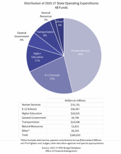 The state’s current operating budget for the 2025-27 biennium (from all fund sources) is $166 billion. A separate capital budget finances major building, renovation and land acquisition projects. The 2025-27 (non-transportation) capital budget for new projects provides $7.5 billion. An additional $7.4 billion is available in reappropriated funds to allow the completion of capital construction projects authorized in previous biennia. Roads, bridges, and other transportation capital projects are budgeted at $9.2 billion. (Total operating/capital budget = $185.1 billion)