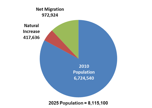 - The natural increase in population — births less deaths — has accounted for about 30.0% of the state’s growth between 2010 and 2025.