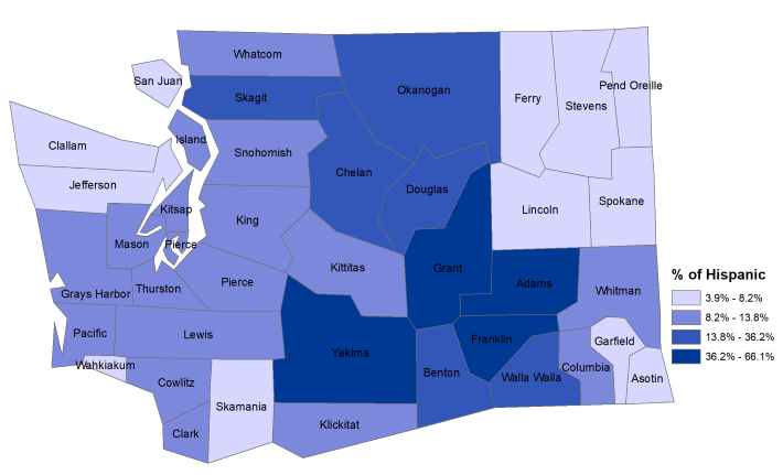 In 2024, the highest percentages of Hispanic residents were found in central Washington with Adams (66.1%), Franklin (55.8%), and Yakima (53.0%) counties posting the highest shares.