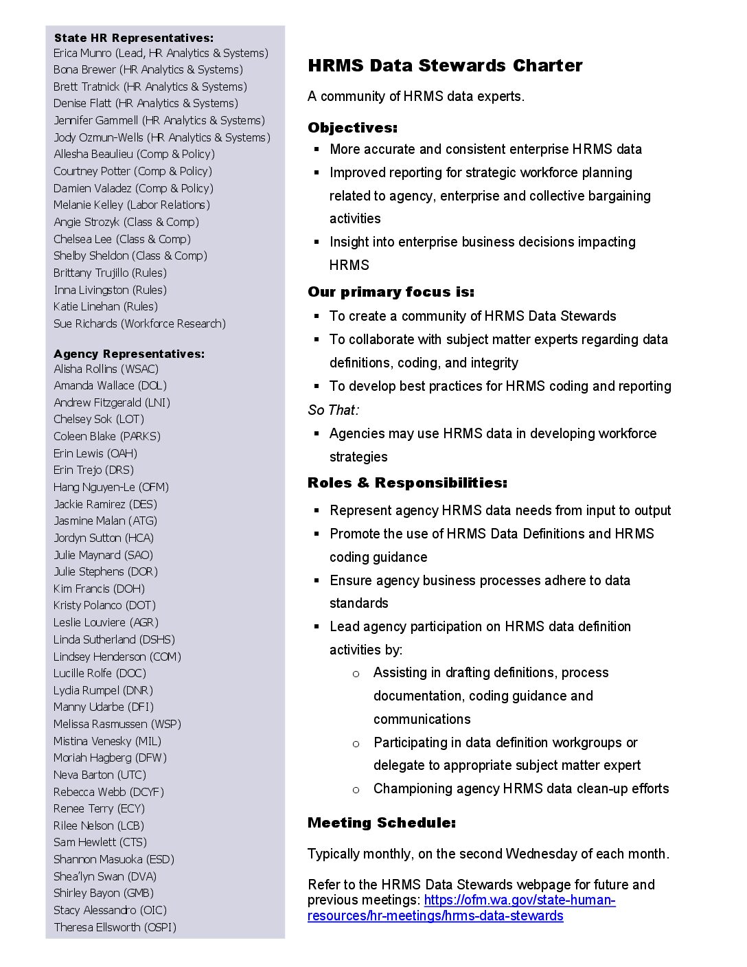 The purpose of the HRMS Data Stewards is to ensure more accurate and consistent HRMS data through collaboration on data definitions, data input and coding practices, and process documentation.