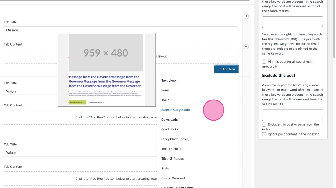 14. Click “Add Row” to start adding content modules and build out the content for each Tab on your page. When you add a module to your page, it will open the fields you will customize with your content.