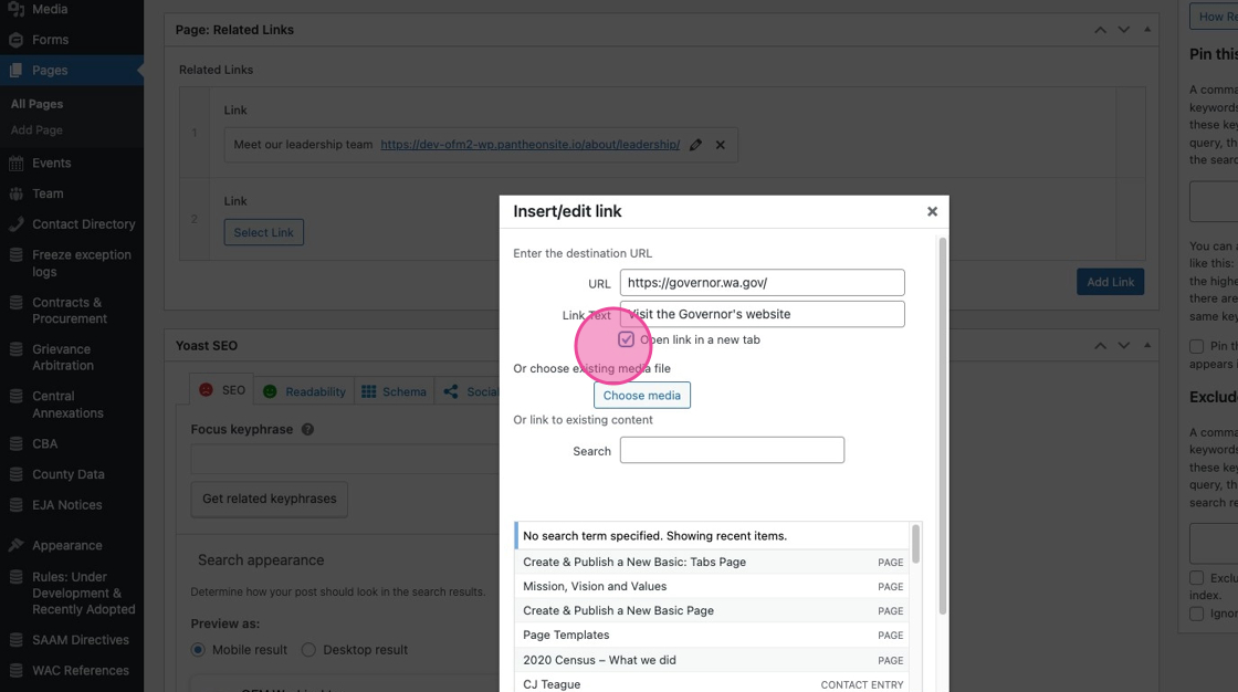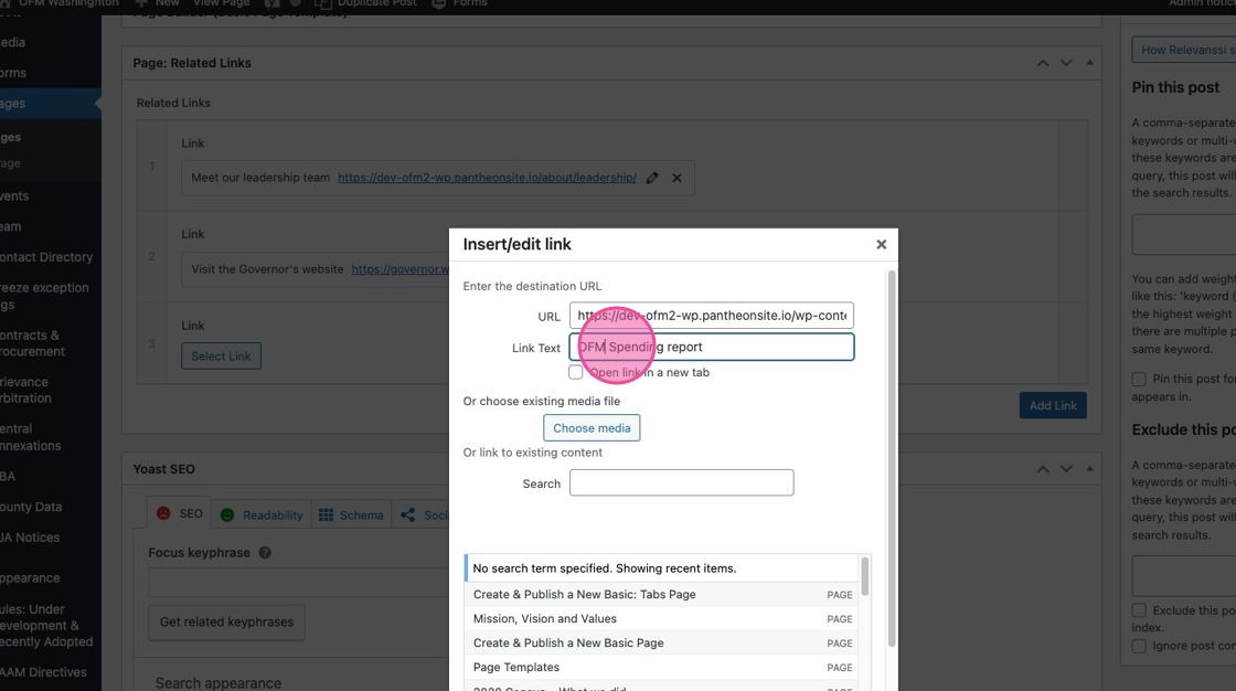 17. If your linking to another page on ofm.wa.gov you can either paste the full link directly into the URL field, or use the Search field to look up a page by its page title.