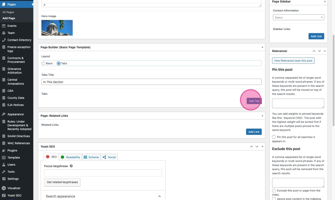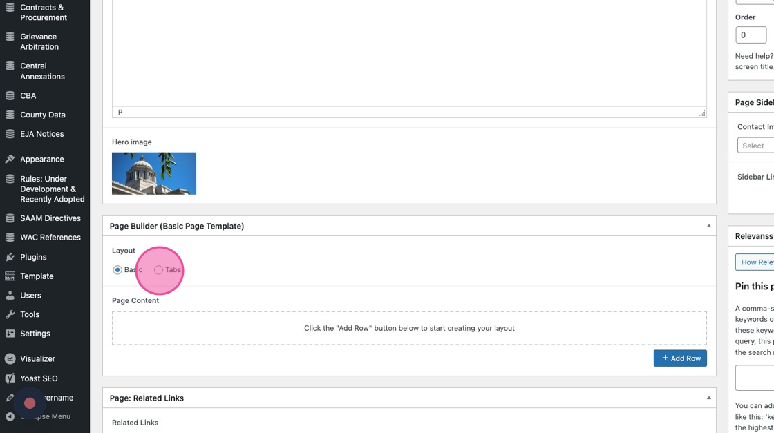 11. Click the Tabs radio dial to start using the “In This Section” template