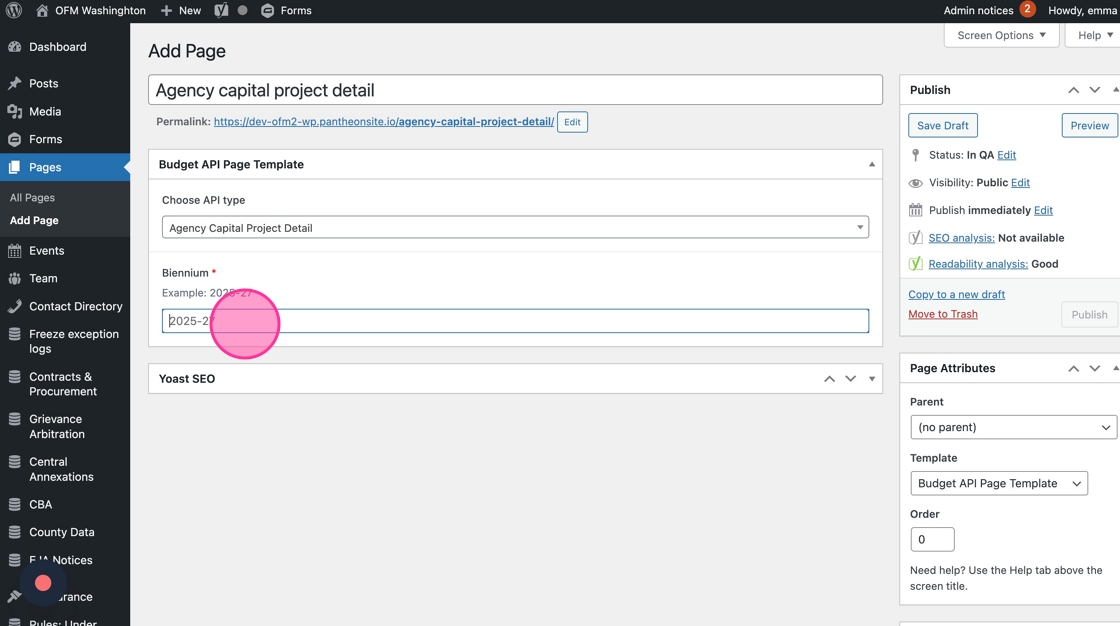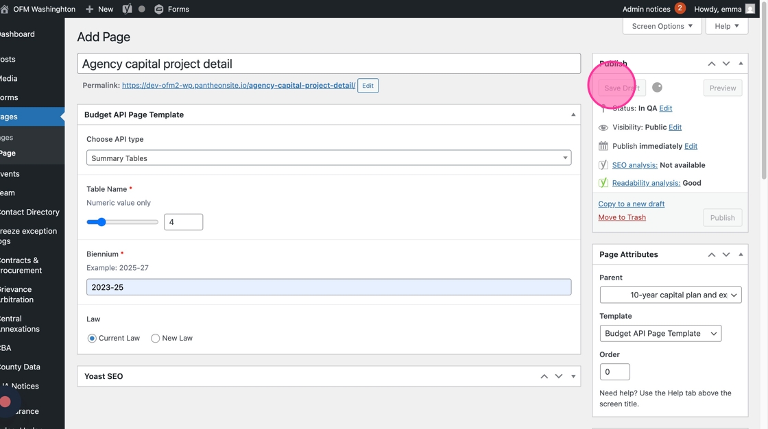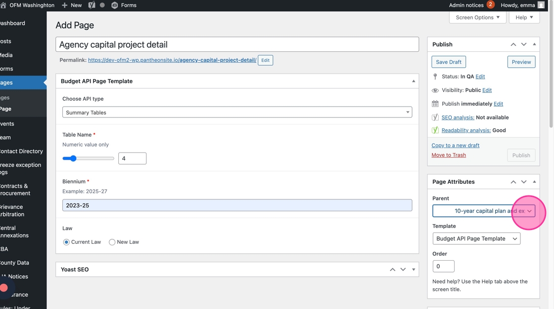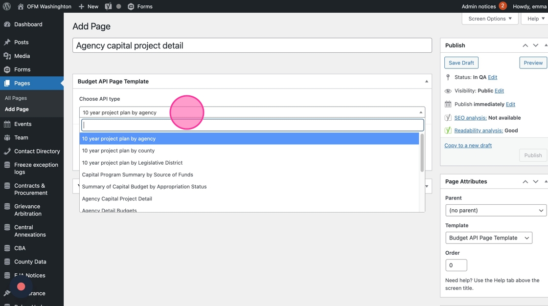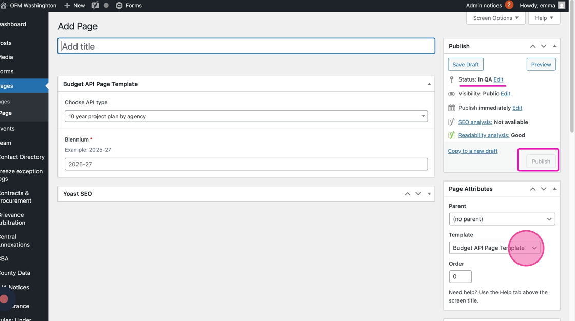 Note: the Budget API page template defaults to “In QA” status, with the Publish button disabled.