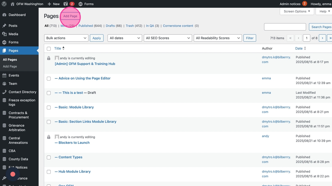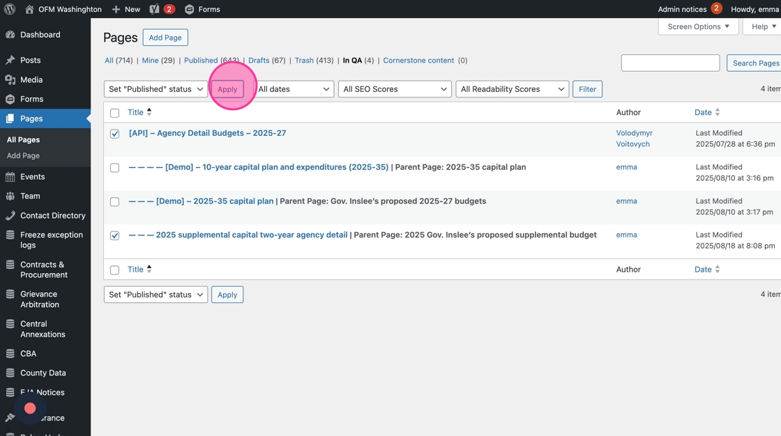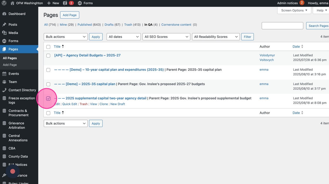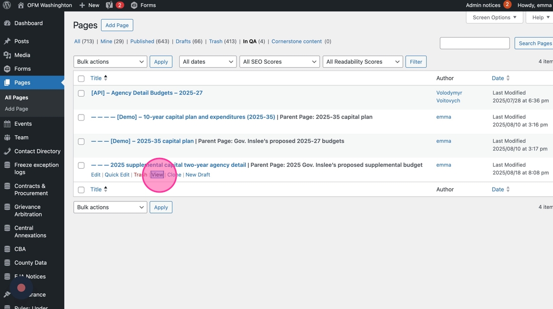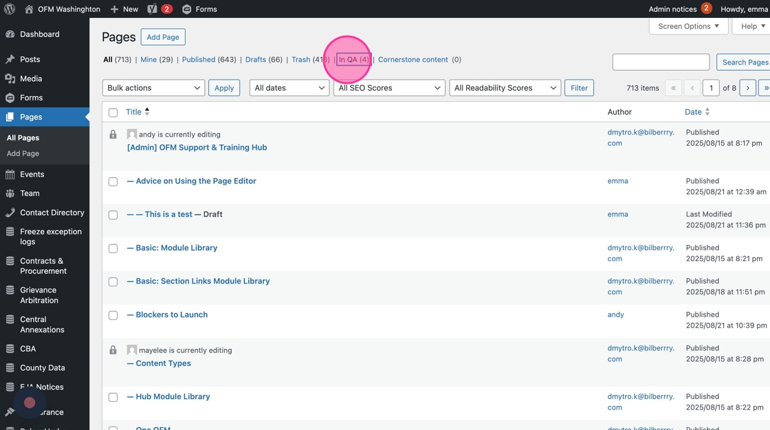 4. You can see what content is set as “In QA” by navigating to Pages > In QA