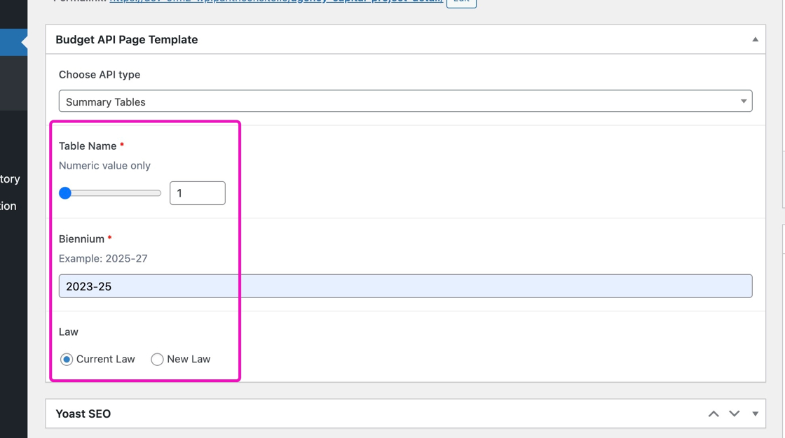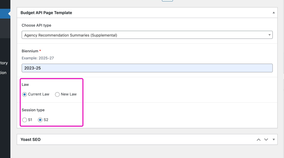 6. Note: For Supplemental budget endpoints, there are additional fields to configure, including Current/New Law and Session Type.