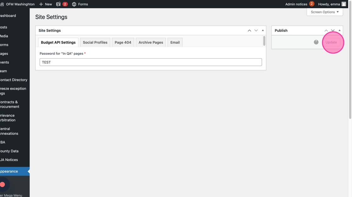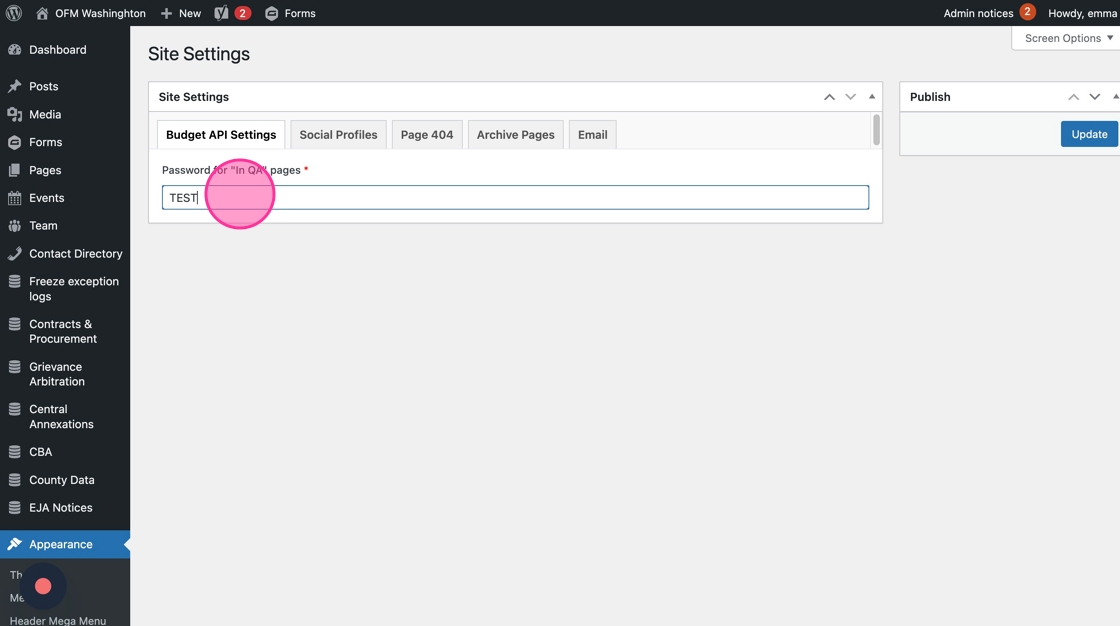 2. Set the password that will allow frontend users to access any content set as “In QA”