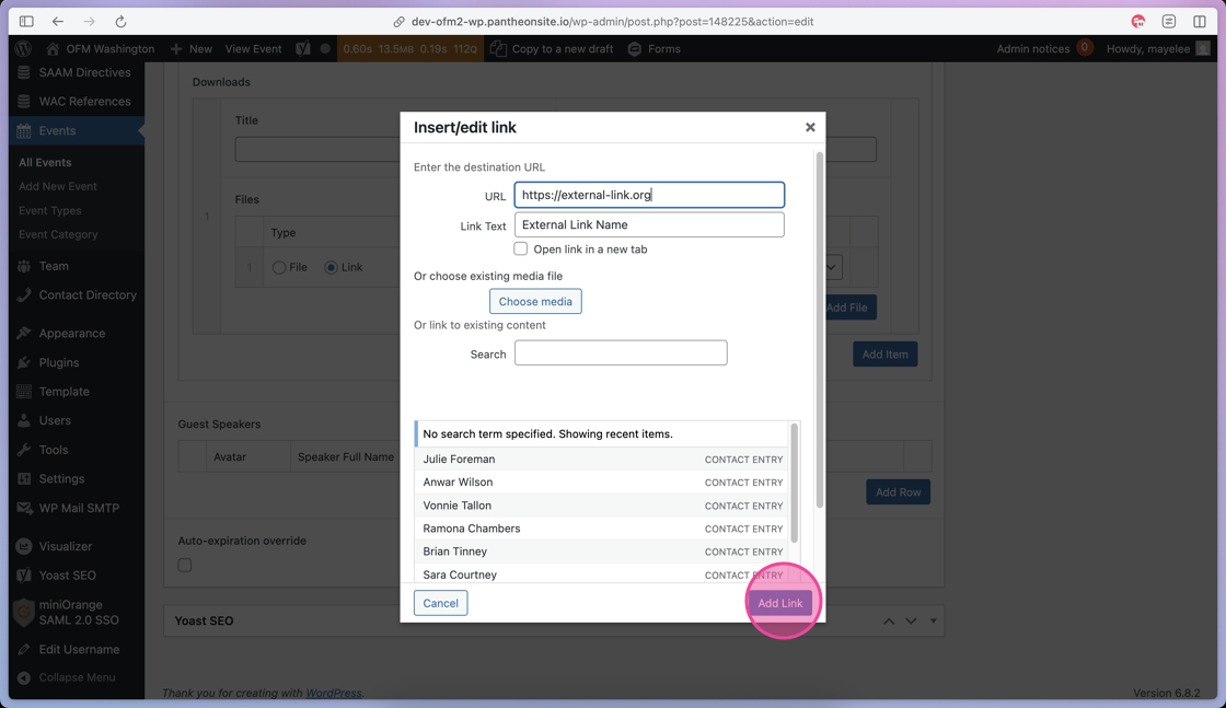 Then, type or scroll through to find the Contact person for this Event post and select their name. If the contact is not listed — you’ll need to add them through the Contact Directory.