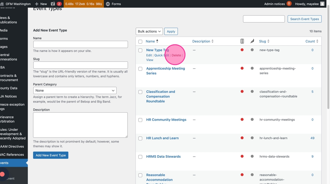 10. Similar to the Category deletion process, you’ll hover over the Type row and click the Delete button to remove it from the list. Note: Proceed with caution as there is no double confirmation or undo option. Deleting a tag will impact the entire organization of the calendar and will impact all links to filtered views of the calendar using this tag.