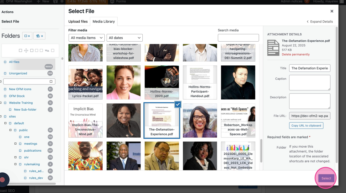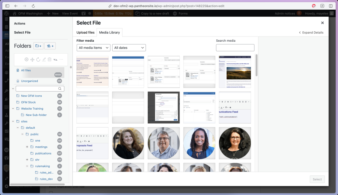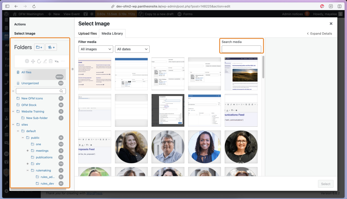 34. With the Media Library open, you can use the Folders or Search Media field to find the image you’d like to add to the post.