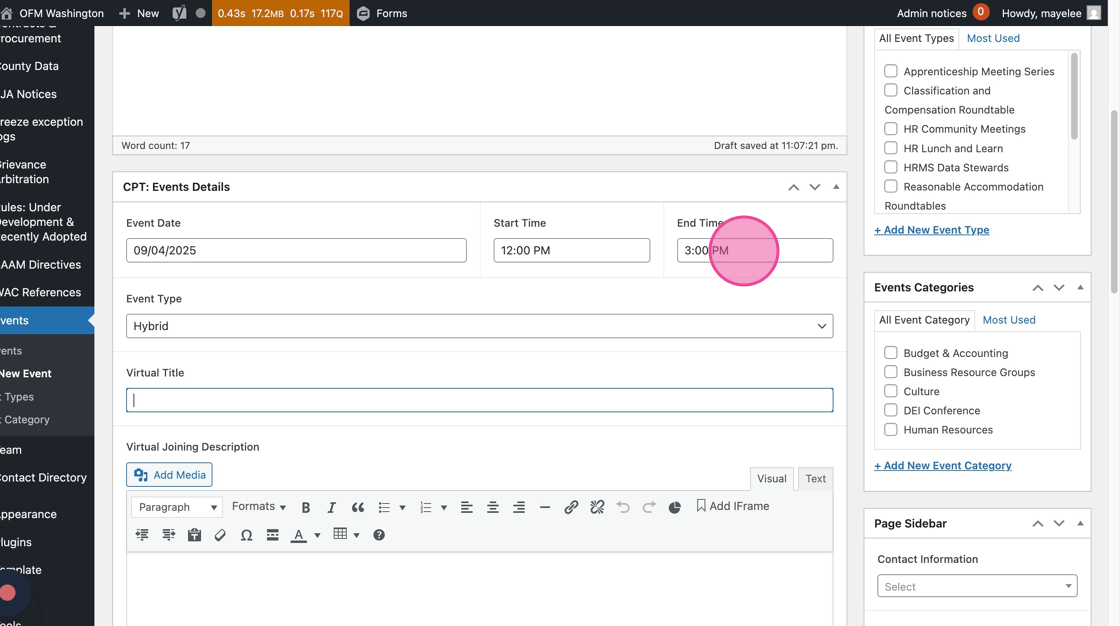 10. If the Event Type is Virtual or Hybrid, you can use the Virtual Title field to label the meeting details section. This is optional — if you do not fill this field in, it will pre-populate the frontend with “Joining Instructions.”