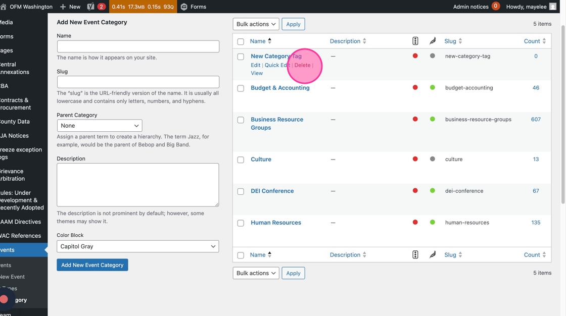 6. If you need to delete a Category tag, you will hover over the category row, then click the Delete option. Note: Proceed with caution as there is no double confirmation or undo option. Deleting a tag will impact the entire organization of the calendar and will impact all links to filtered views of the calendar using this tag.