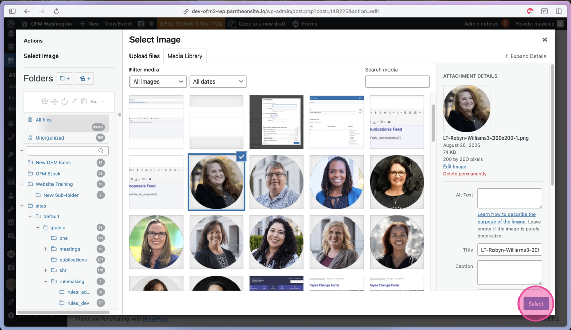 25. You can use the Folders on the left or the Search Media field to find the correct image to be added as the Guest Speaker’s avatar.