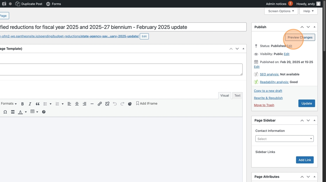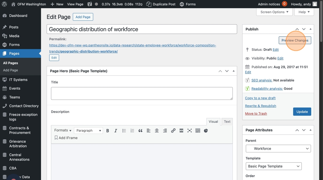 9. Next, “Preview Changes” to make sure it looks how you want, checking that the new content is correctly placed and the old short code is deleted.
