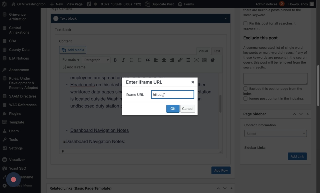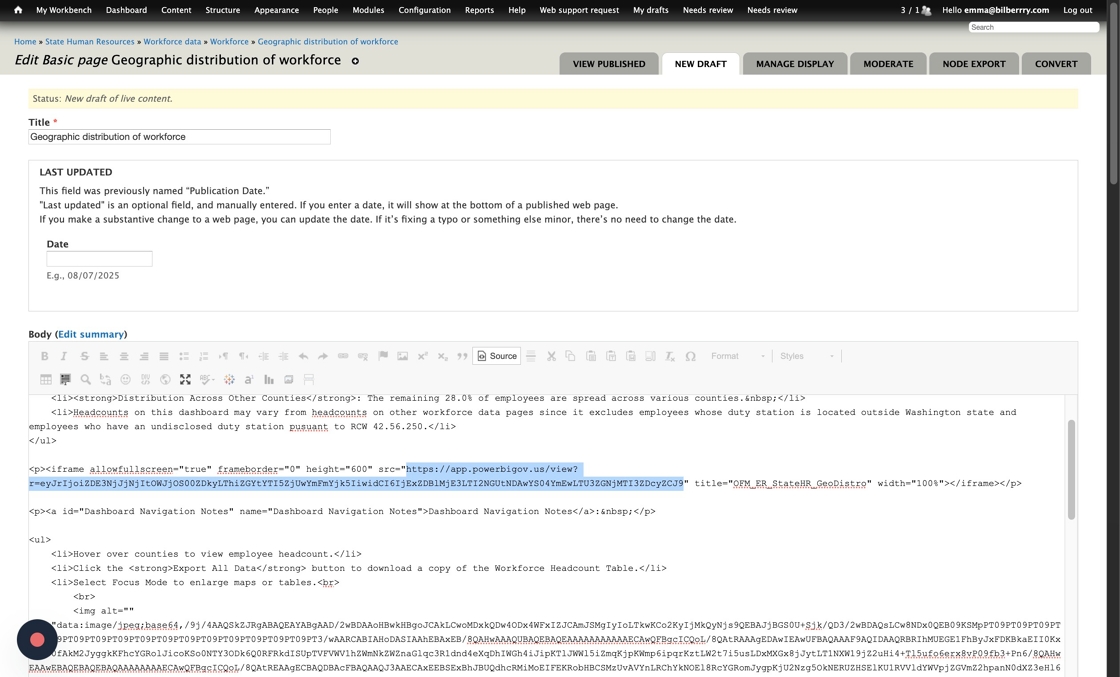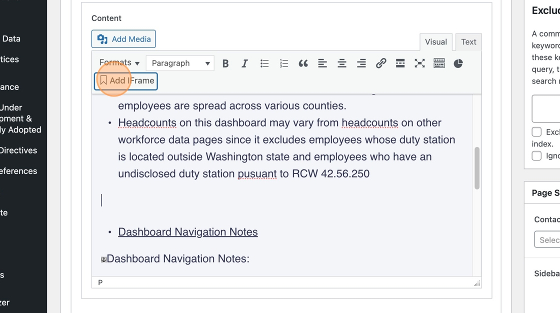 When we moved the site, iFrames such as PowerBI Dashboards did not come through, so we need to re-insert them. Here’s what an iFrame looks like on the existing OFM site.