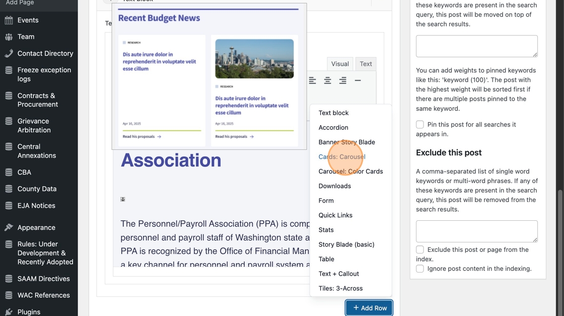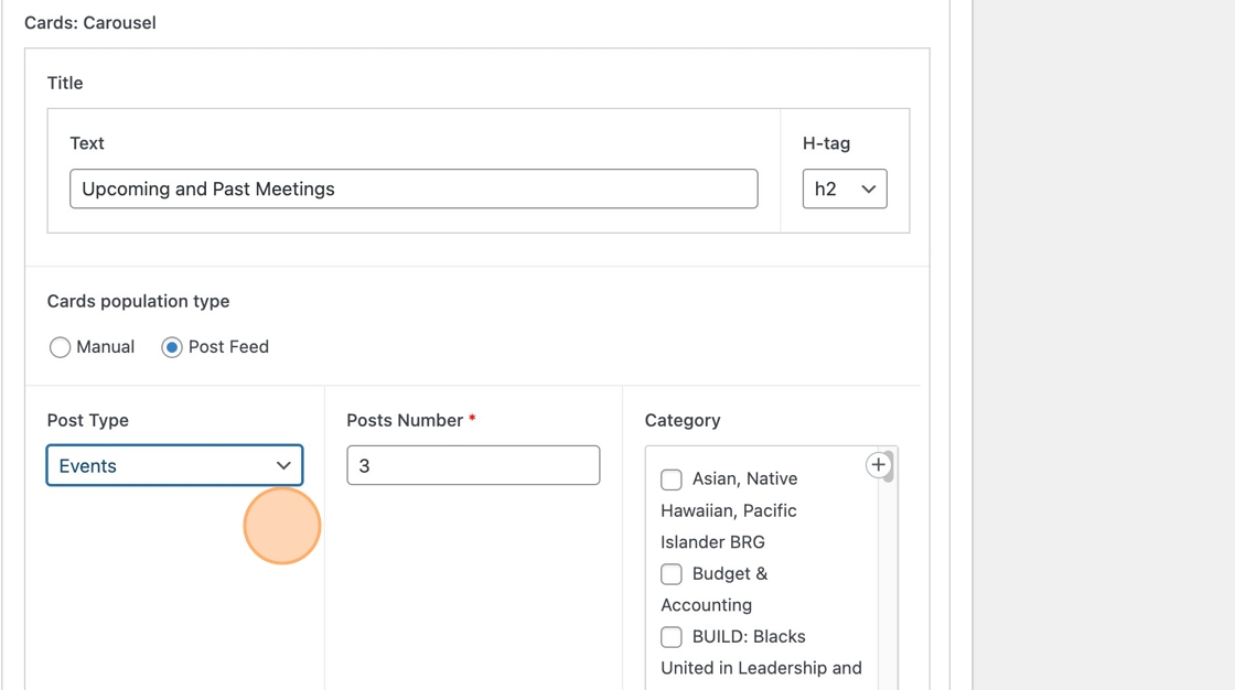 6. Then, update the module settings as needed. In this example, we are setting the cards carousel to show events in a certain category.