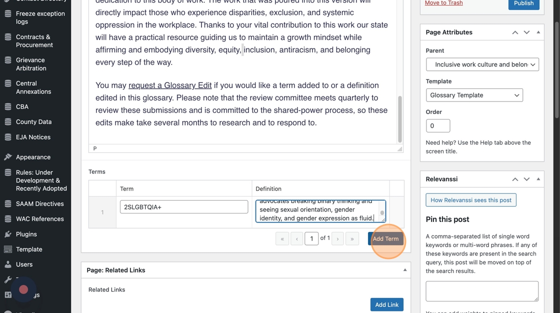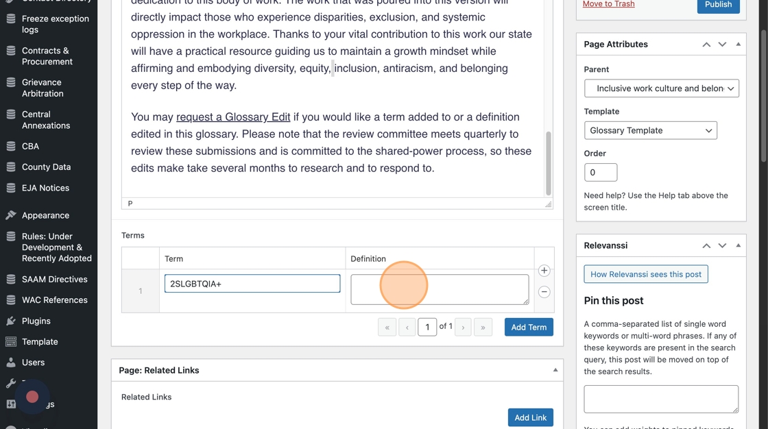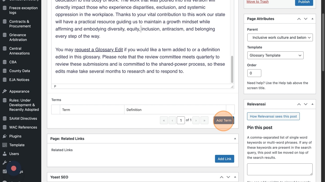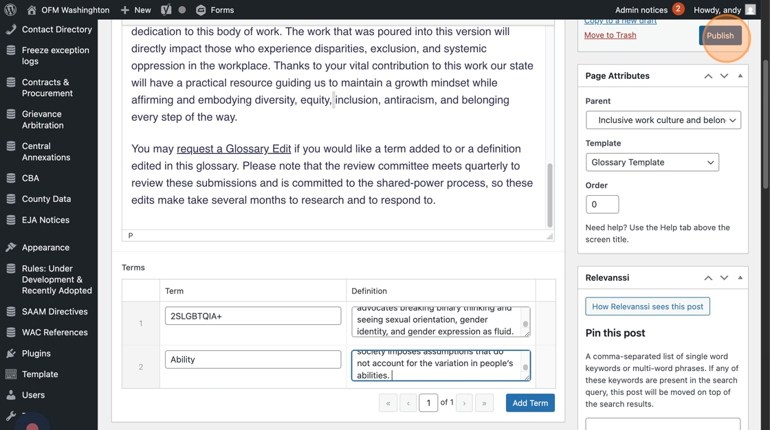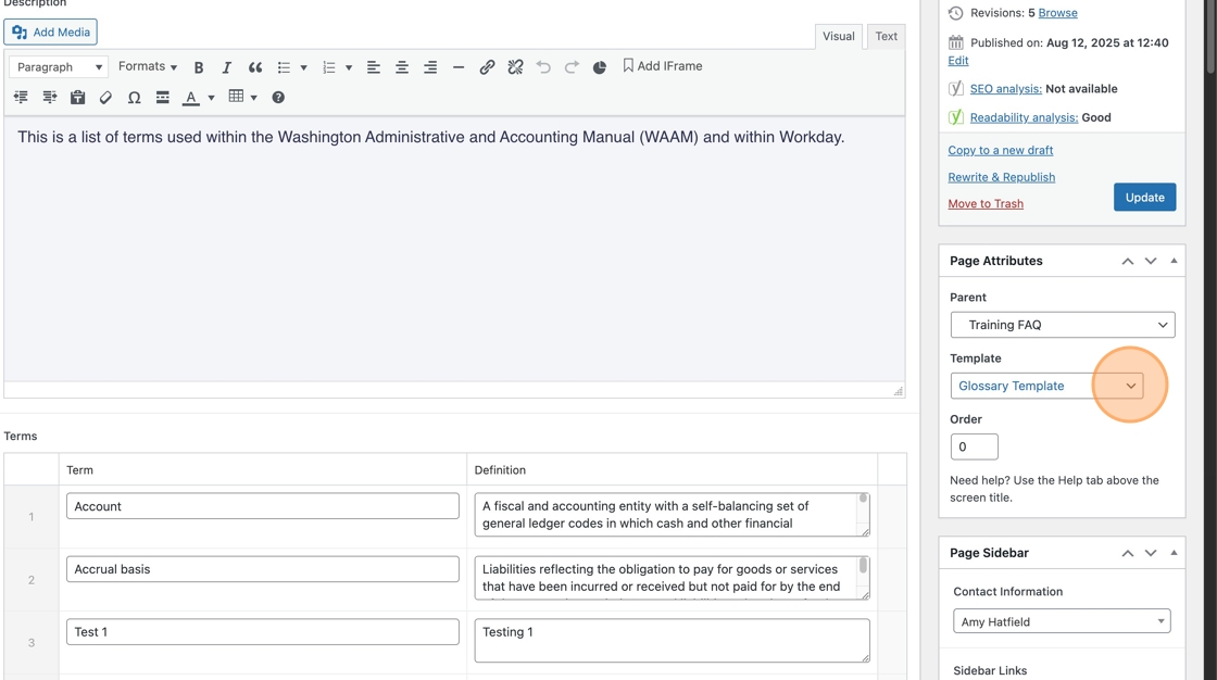 1. Go to the page you’re updating in WordPress. To use the glossary, you’ll need to select “Glossary Template” in the Page Attributes dropdown.