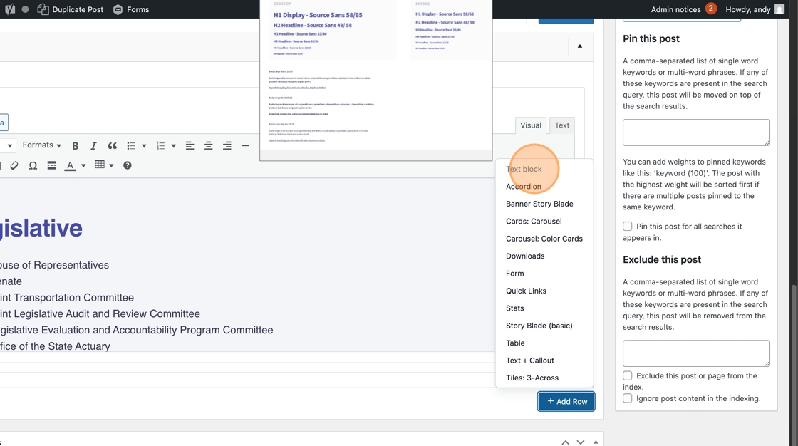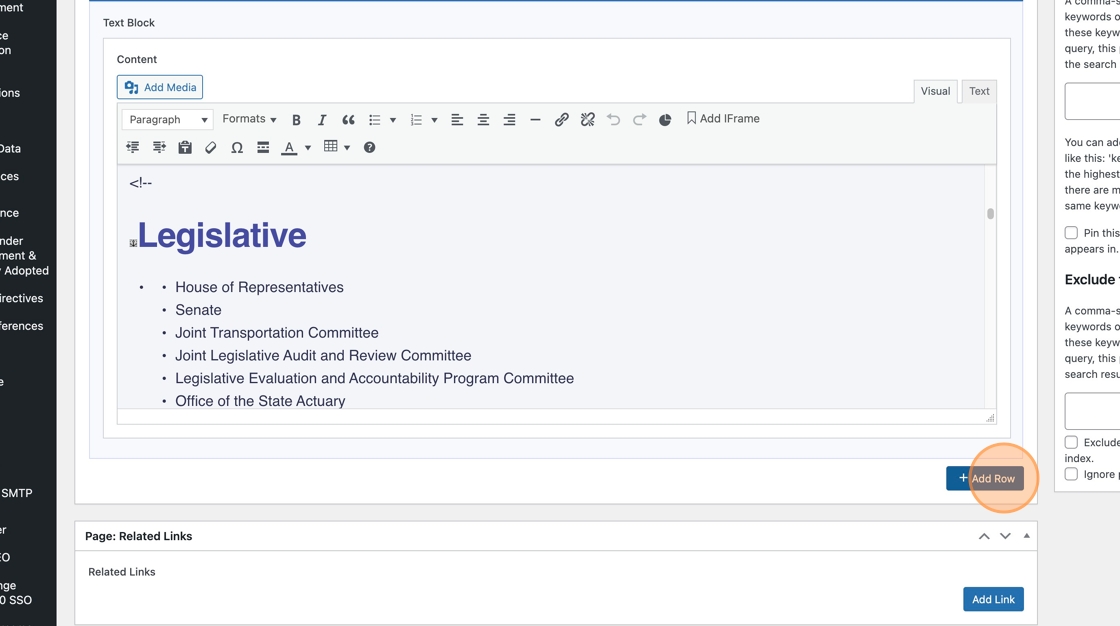 6. Click Add Row to select add the Text Block module to the page.