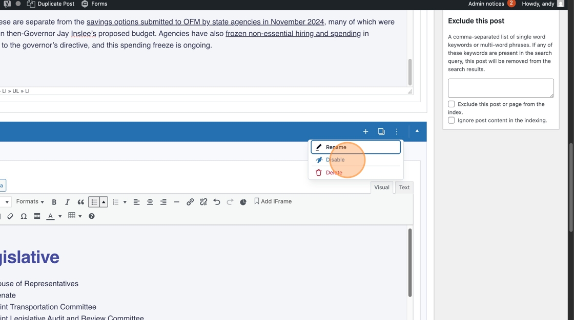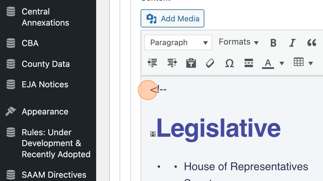 1. If your page in Drupal used the <! short code to disable content and you’d like to retain that disabled content, you’ll need to move that content into its own text box and use the WordPress disable feature. Otherwise, the content and the short code will appear on the site, which is not what we want.