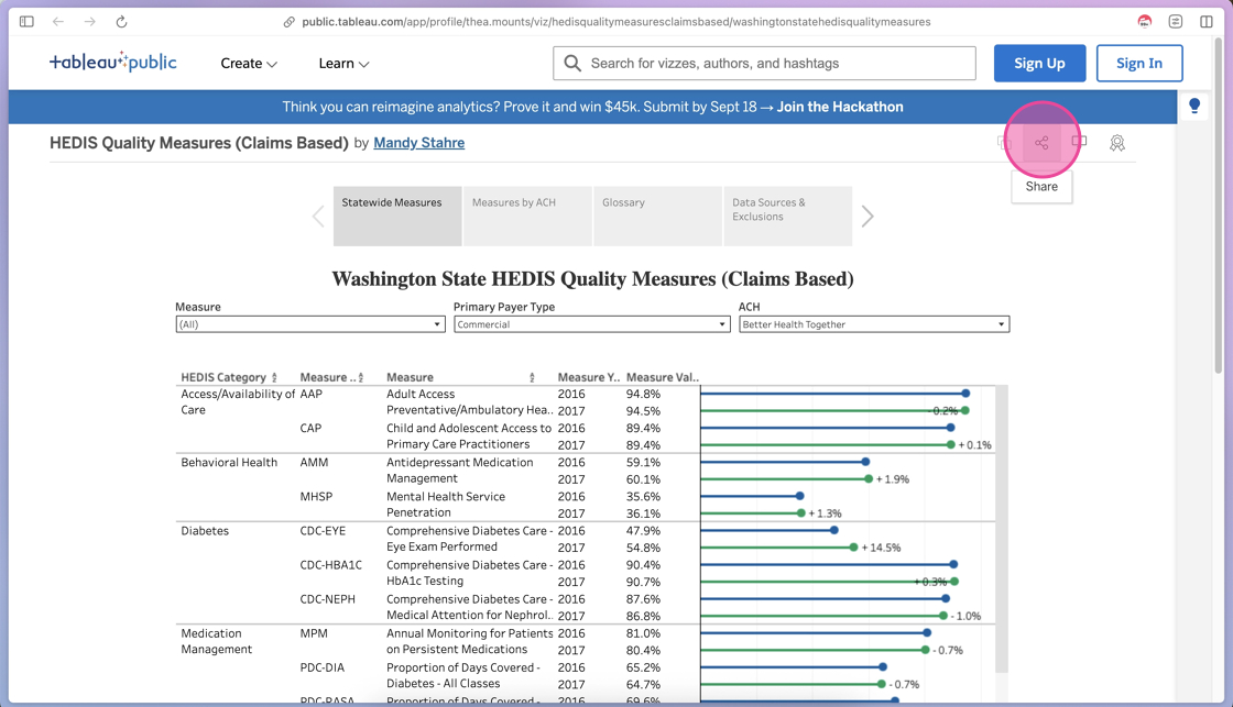 Click the Share icon to open the Share options for the Tableau visual